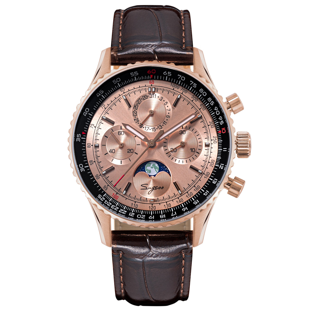 S468.RS.B (SUGESS Upgrade Gold Swan Neck Sea-gull ST1908 movement)Function: 12 Hours and seconds Indicator, Date Indicator, 29 ½ Days MoonPhase Display, 30 Minutes Chronograph