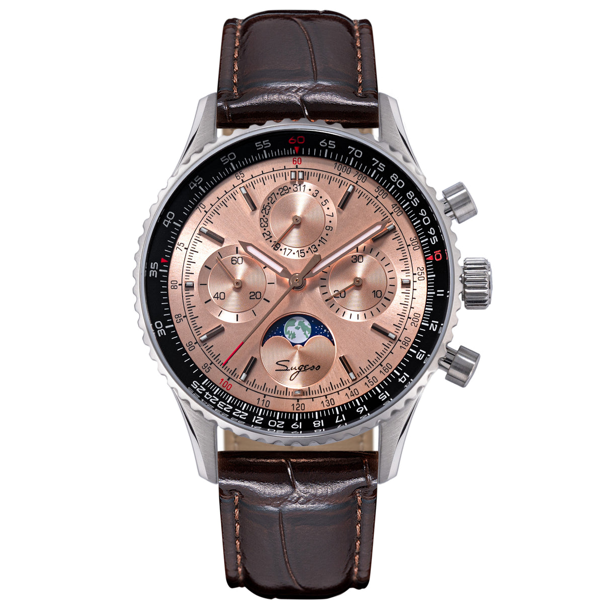 S468.SS.B (SUGESS Upgrade Gold Swan Neck Sea-gull ST1908 movement)Function: 12 Hours and seconds Indicator, Date Indicator, 29 ½ Days MoonPhase Display, 30 Minutes Chronograph